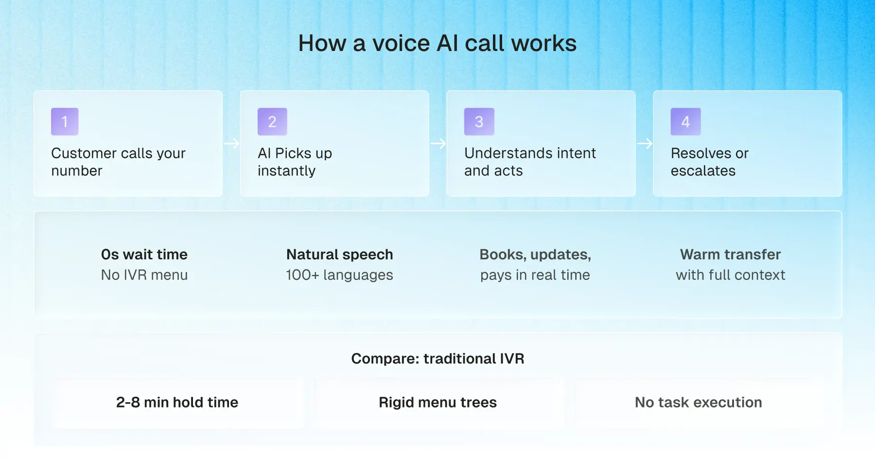 Voice AI closes the gap between what customers expect and what human-agent operations can deliver. Instead of forcing callers through rigid phone menus or making them wait in a queue, it lets them speak naturally and get real answers in real time. Repetitive call volume drops, resolution times shrink, and operations scale without proportional hiring.