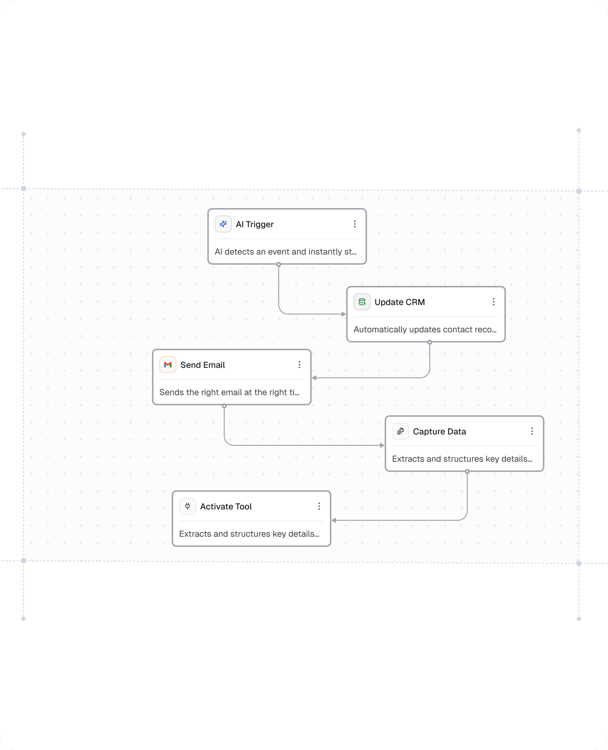 Use AI triggers to automate CRM updates, send emails, route calls, capture structured data, and activate internal tools. With real-time machine learning powering every step, your AI workflow tool seamlessly connects actions, removes bottlenecks, and helps teams save time.
